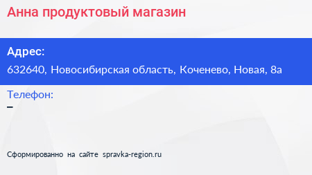 Анна, продуктовый магазин по адресу 632640, Новосибирская область, Коченево, Новая, 8а в дальнейшем Организация, размещена в следующих категориях: