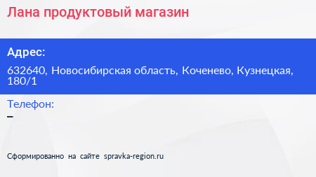 Лана, продуктовый магазин по адресу 632640, Новосибирская область, Коченево, Кузнецкая, 180/1 в дальнейшем Организация, размещена в следующих категориях: