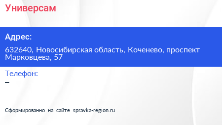 Универсам по адресу 632640, Новосибирская область, Коченево, проспект Марковцева, 57 в дальнейшем Организация, размещена в следующих категориях: