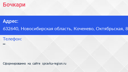 Бочкари по адресу 632640, Новосибирская область, Коченево, Октябрьская, 8 в дальнейшем Организация, размещена в следующих категориях: