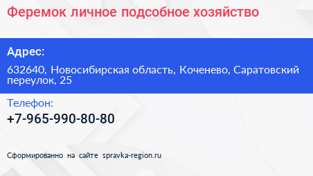 Феремок, личное подсобное хозяйство по адресу 632640, Новосибирская область, Коченево, Саратовский переулок, 25 в дальнейшем Организация, размещена в следующих категориях: