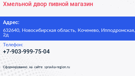 Хмельной двор, пивной магазин по адресу 632640, Новосибирская область, Коченево, Ипподромская, 2д в дальнейшем Организация, размещена в следующих категориях: