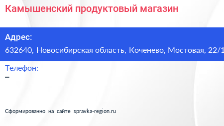 Камышенский, продуктовый магазин по адресу 632640, Новосибирская область, Коченево, Мостовая, 22/1 в дальнейшем Организация, размещена в следующих категориях: