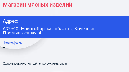 Магазин мясных изделий по адресу 632640, Новосибирская область, Коченево, Промышленная, 4 в дальнейшем Организация, размещена в следующих категориях: