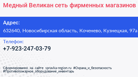 Медный Великан, сеть фирменных магазинов по адресу 632640, Новосибирская область, Коченево, Кузнецкая, 97а в дальнейшем Организация, размещена в следующих категориях: