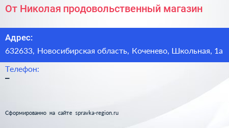 От Николая, продовольственный магазин по адресу 632633, Новосибирская область, Коченево, Школьная, 1а в дальнейшем Организация, размещена в следующих категориях: