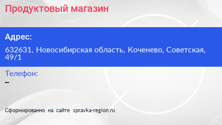 Продуктовый магазин по адресу 632631, Новосибирская область, Коченево, Советская, 49/1 в дальнейшем Организация, размещена в следующих категориях: