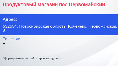 Продуктовый магазин, пос. Первомайский по адресу 632634, Новосибирская область, Коченево, Первомайская, 8 в дальнейшем Организация, размещена в следующих категориях: