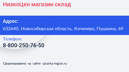 НизкоЦен, магазин-склад по адресу 632640, Новосибирская область, Коченево, Пушкина, 69 в дальнейшем Организация, размещена в следующих категориях: