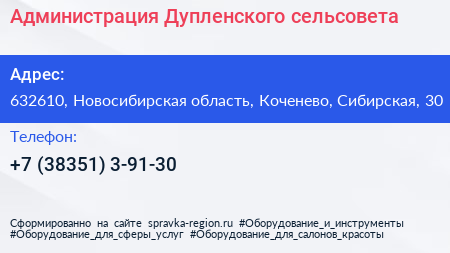Администрация Дупленского сельсовета по адресу 632610, Новосибирская область, Коченево, Сибирская, 30 в дальнейшем Организация, размещена в следующих категориях: