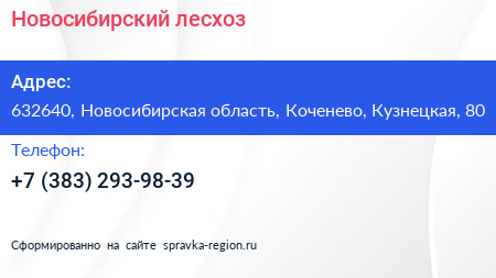 Новосибирский лесхоз по адресу 632640, Новосибирская область, Коченево, Кузнецкая, 80 в дальнейшем Организация, размещена в следующих категориях:
