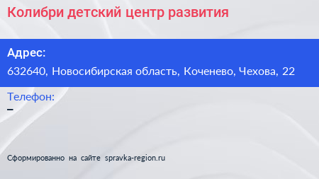 Колибри, детский центр развития по адресу 632640, Новосибирская область, Коченево, Чехова, 22 в дальнейшем Организация, размещена в следующих категориях: