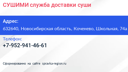 СУШИМИ, служба доставки суши по адресу 632640, Новосибирская область, Коченево, Школьная, 74а в дальнейшем Организация, размещена в следующих категориях: