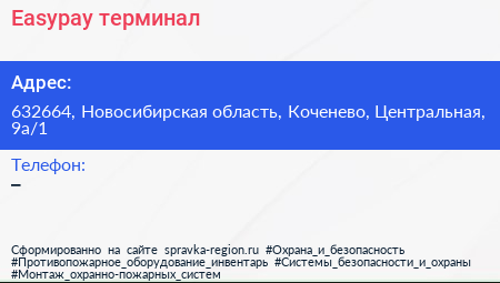 Easypay, терминал по адресу 632664, Новосибирская область, Коченево, Центральная, 9а/1 в дальнейшем Организация, размещена в следующих категориях: