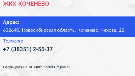ЖКХ-КОЧЕНЕВО по адресу 632640, Новосибирская область, Коченево, Чехова, 22 в дальнейшем Организация, размещена в следующих категориях: