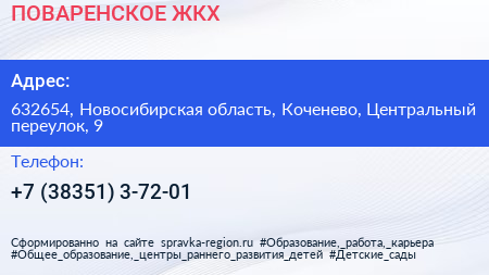 ПОВАРЕНСКОЕ ЖКХ по адресу 632654, Новосибирская область, Коченево, Центральный переулок, 9 в дальнейшем Организация, размещена в следующих категориях: