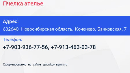 Пчелка, ателье по адресу 632640, Новосибирская область, Коченево, Банковская, 7 в дальнейшем Организация, размещена в следующих категориях: