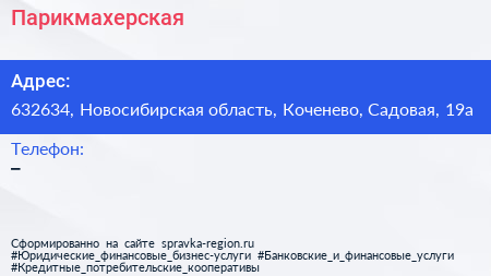 Парикмахерская по адресу 632634, Новосибирская область, Коченево, Садовая, 19а в дальнейшем Организация, размещена в следующих категориях: