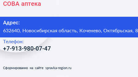 СОВА, аптека по адресу 632640, Новосибирская область, Коченево, Октябрьская, 8 в дальнейшем Организация, размещена в следующих категориях:
