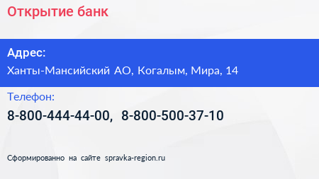 Открытие, банк по адресу Ханты-Мансийский АО, Когалым, Мира, 14 в дальнейшем Организация, размещена в следующих категориях: