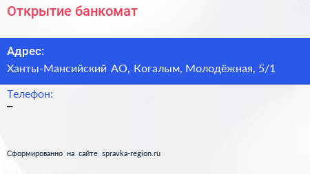 Открытие, банкомат по адресу Ханты-Мансийский АО, Когалым, Молодёжная, 5/1 в дальнейшем Организация, размещена в следующих категориях: