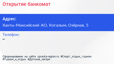 Открытие, банкомат по адресу Ханты-Мансийский АО, Когалым, Озёрная, 5 в дальнейшем Организация, размещена в следующих категориях: