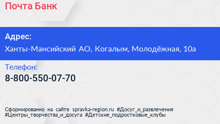 Почта Банк по адресу Ханты-Мансийский АО, Когалым, Молодёжная, 10а в дальнейшем Организация, размещена в следующих категориях: