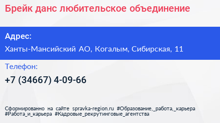 Брейк-данс, любительское объединение по адресу Ханты-Мансийский АО, Когалым, Сибирская, 11 в дальнейшем Организация, размещена в следующих категориях: