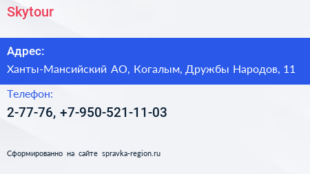 Skytour по адресу Ханты-Мансийский АО, Когалым, Дружбы Народов, 11 в дальнейшем Организация, размещена в следующих категориях: