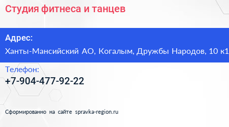 Студия фитнеса и танцев по адресу Ханты-Мансийский АО, Когалым, Дружбы Народов, 10 к1 в дальнейшем Организация, размещена в следующих категориях: