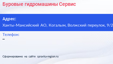 Буровые гидромашины-Сервис по адресу Ханты-Мансийский АО, Когалым, Волжский переулок, 9/2 в дальнейшем Организация, размещена в следующих категориях:
