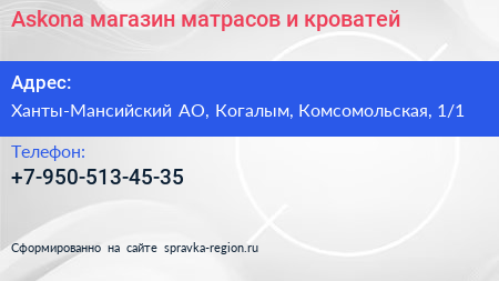 Askona, магазин матрасов и кроватей по адресу Ханты-Мансийский АО, Когалым, Комсомольская, 1/1 в дальнейшем Организация, размещена в следующих категориях: