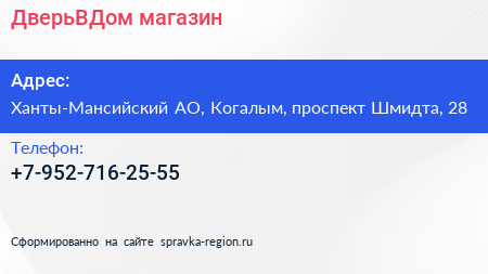 ДверьВДом, магазин по адресу Ханты-Мансийский АО, Когалым, проспект Шмидта, 28 в дальнейшем Организация, размещена в следующих категориях: