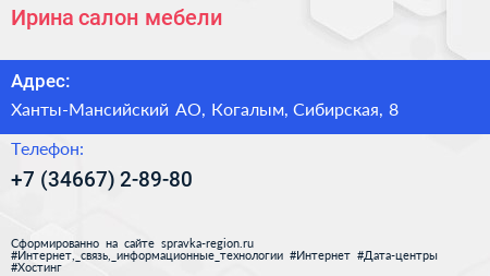 Ирина, салон мебели по адресу Ханты-Мансийский АО, Когалым, Сибирская, 8 в дальнейшем Организация, размещена в следующих категориях: