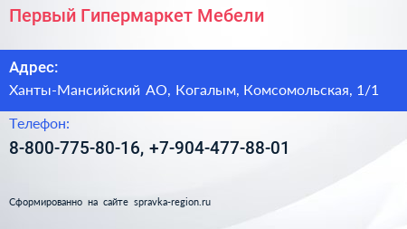 Первый Гипермаркет Мебели по адресу Ханты-Мансийский АО, Когалым, Комсомольская, 1/1 в дальнейшем Организация, размещена в следующих категориях: