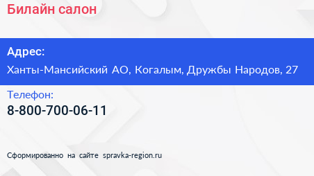 Билайн, салон по адресу Ханты-Мансийский АО, Когалым, Дружбы Народов, 27 в дальнейшем Организация, размещена в следующих категориях: