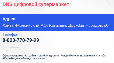 DNS, цифровой супермаркет по адресу Ханты-Мансийский АО, Когалым, Дружбы Народов, 60 в дальнейшем Организация, размещена в следующих категориях: