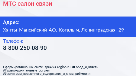 МТС, салон связи по адресу Ханты-Мансийский АО, Когалым, Ленинградская, 29 в дальнейшем Организация, размещена в следующих категориях: