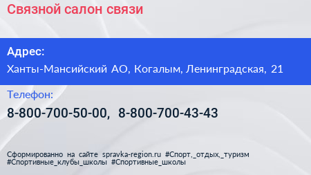 Связной, салон связи по адресу Ханты-Мансийский АО, Когалым, Ленинградская, 21 в дальнейшем Организация, размещена в следующих категориях: