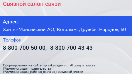 Связной, салон связи по адресу Ханты-Мансийский АО, Когалым, Дружбы Народов, 60 в дальнейшем Организация, размещена в следующих категориях: