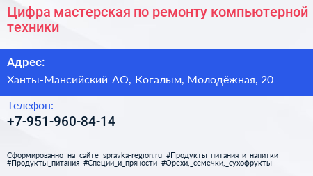 Цифра, мастерская по ремонту компьютерной техники по адресу Ханты-Мансийский АО, Когалым, Молодёжная, 20 в дальнейшем Организация, размещена в следующих категориях: