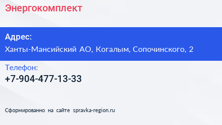 Энергокомплект по адресу Ханты-Мансийский АО, Когалым, Сопочинского, 2 в дальнейшем Организация, размещена в следующих категориях:
