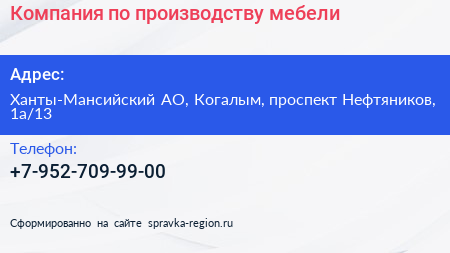 Компания по производству мебели по адресу Ханты-Мансийский АО, Когалым, проспект Нефтяников, 1а/13 в дальнейшем Организация, размещена в следующих категориях: