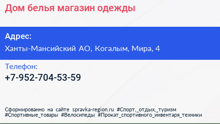 Дом белья, магазин одежды по адресу Ханты-Мансийский АО, Когалым, Мира, 4 в дальнейшем Организация, размещена в следующих категориях: