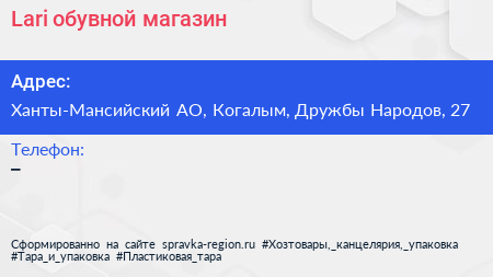 Lari, обувной магазин по адресу Ханты-Мансийский АО, Когалым, Дружбы Народов, 27 в дальнейшем Организация, размещена в следующих категориях: