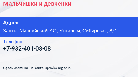 Мальчишки и девченки по адресу Ханты-Мансийский АО, Когалым, Сибирская, 8/1 в дальнейшем Организация, размещена в следующих категориях:
