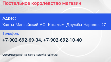 Постельное королевство, магазин по адресу Ханты-Мансийский АО, Когалым, Дружбы Народов, 27 в дальнейшем Организация, размещена в следующих категориях: