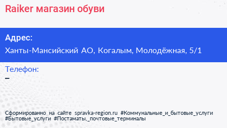 Raiker, магазин обуви по адресу Ханты-Мансийский АО, Когалым, Молодёжная, 5/1 в дальнейшем Организация, размещена в следующих категориях: