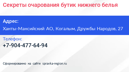 Секреты очарования, бутик нижнего белья по адресу Ханты-Мансийский АО, Когалым, Дружбы Народов, 27 в дальнейшем Организация, размещена в следующих категориях: