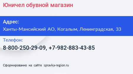Юничел, обувной магазин по адресу Ханты-Мансийский АО, Когалым, Ленинградская, 33 в дальнейшем Организация, размещена в следующих категориях: